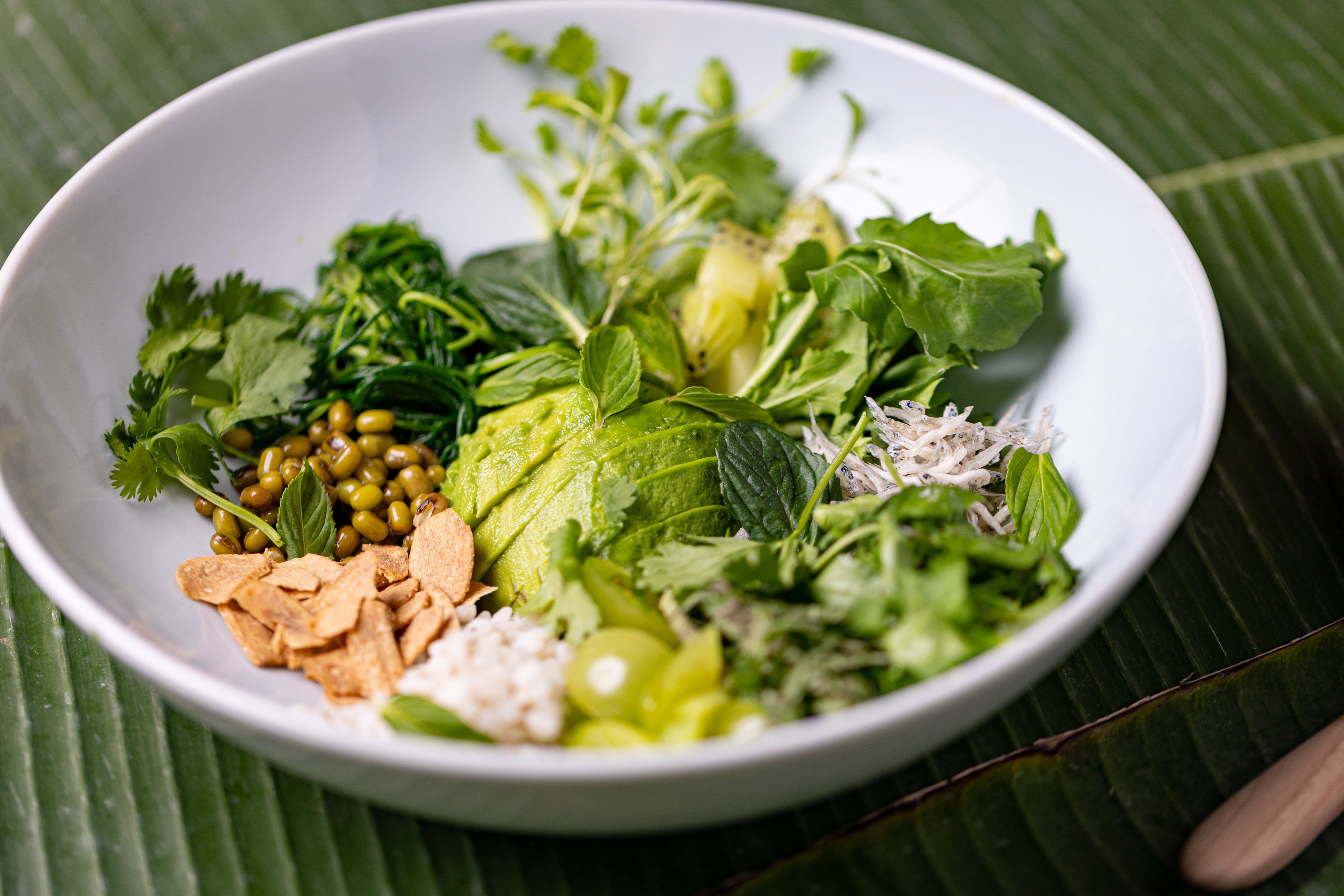 グリルした牛タンに、酸味を効かせたコールスロー、甘味をプラスしたコールスロー、上にたっぷりのせたハーブをざくざくミックスして食べるグリーングラスサラダ。仕上げにライムをぎゅっと絞って。刻んだレモングラスの風味と食感が面白く、2種のコールスローが徐々に合わさって、味に奥行きを持たせてくれます。ジューシーで柔らかな牛タンの旨味をハーブが引き立て、「新しいアジア」を感じられるサラダが出来上がりました。