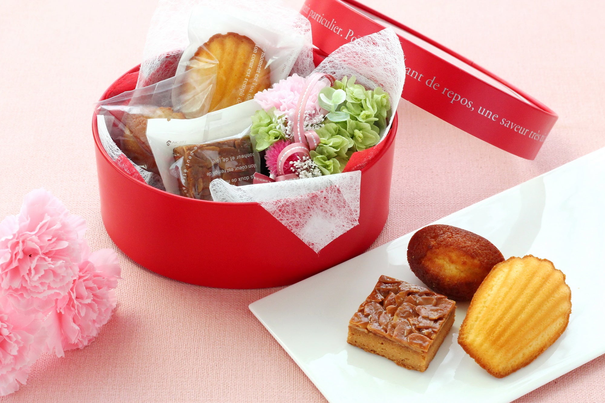 ホテルメイドの焼き菓子と、ハート型のフォルムが可愛らしい陶器にカーネーションのプリザーブドフラワーをセットにした、母の日限定ギフトです。