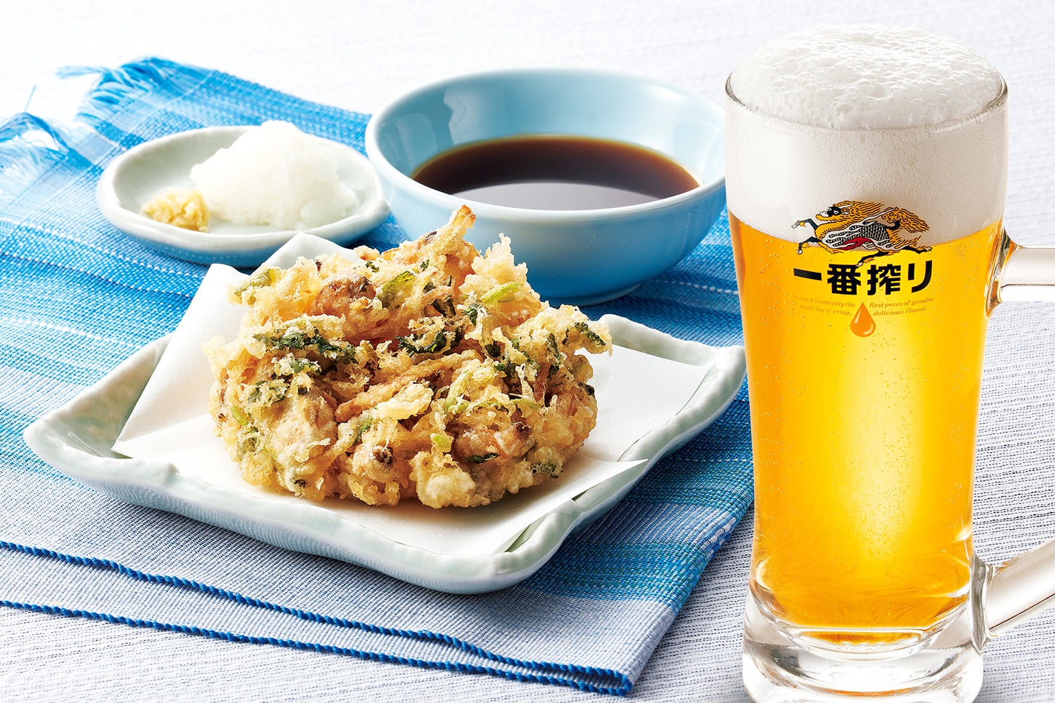 初夏天丼に使用している「あさりと生姜のかき揚げ」と生ビールがセットになった、てんやのちょい飲みセットです。