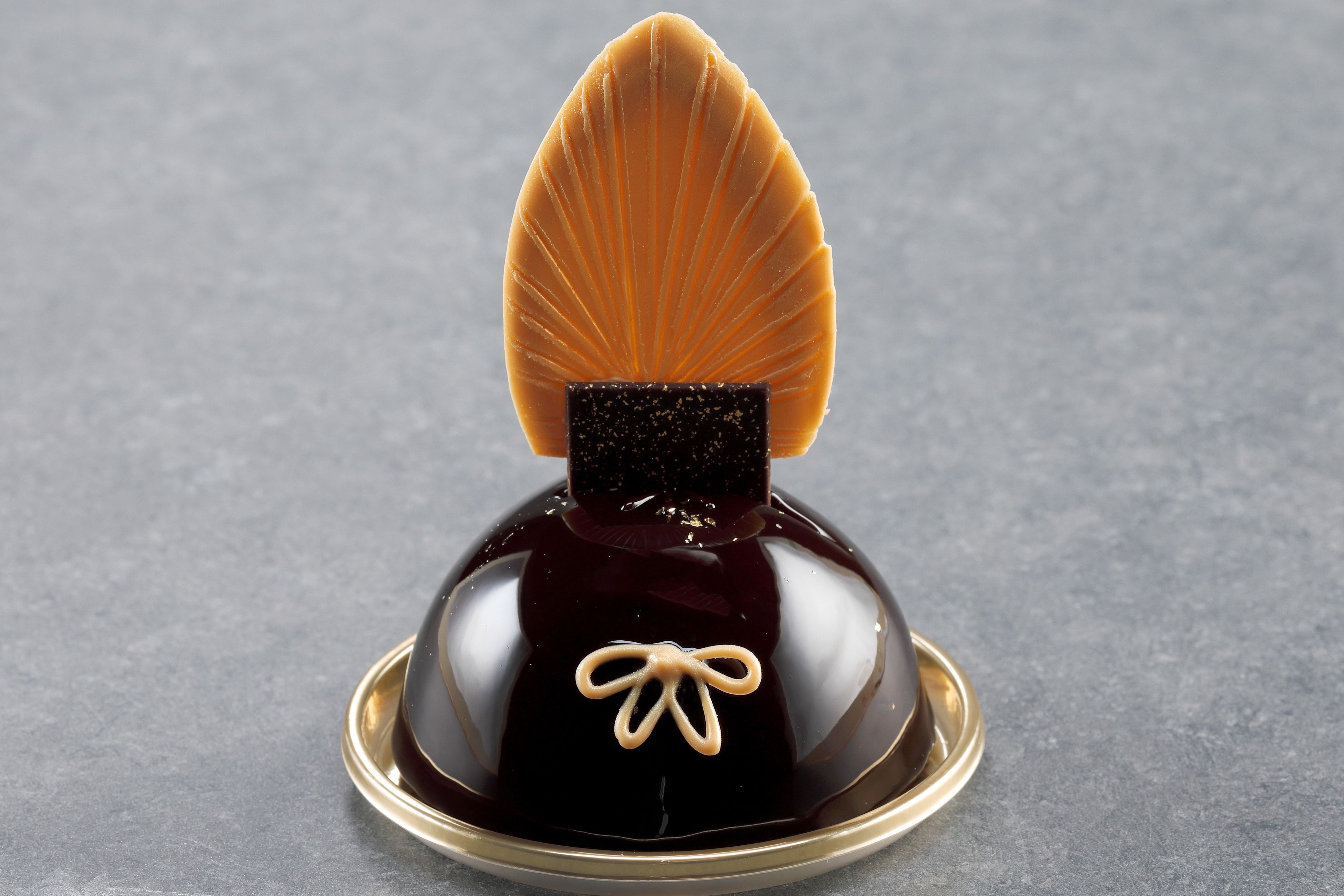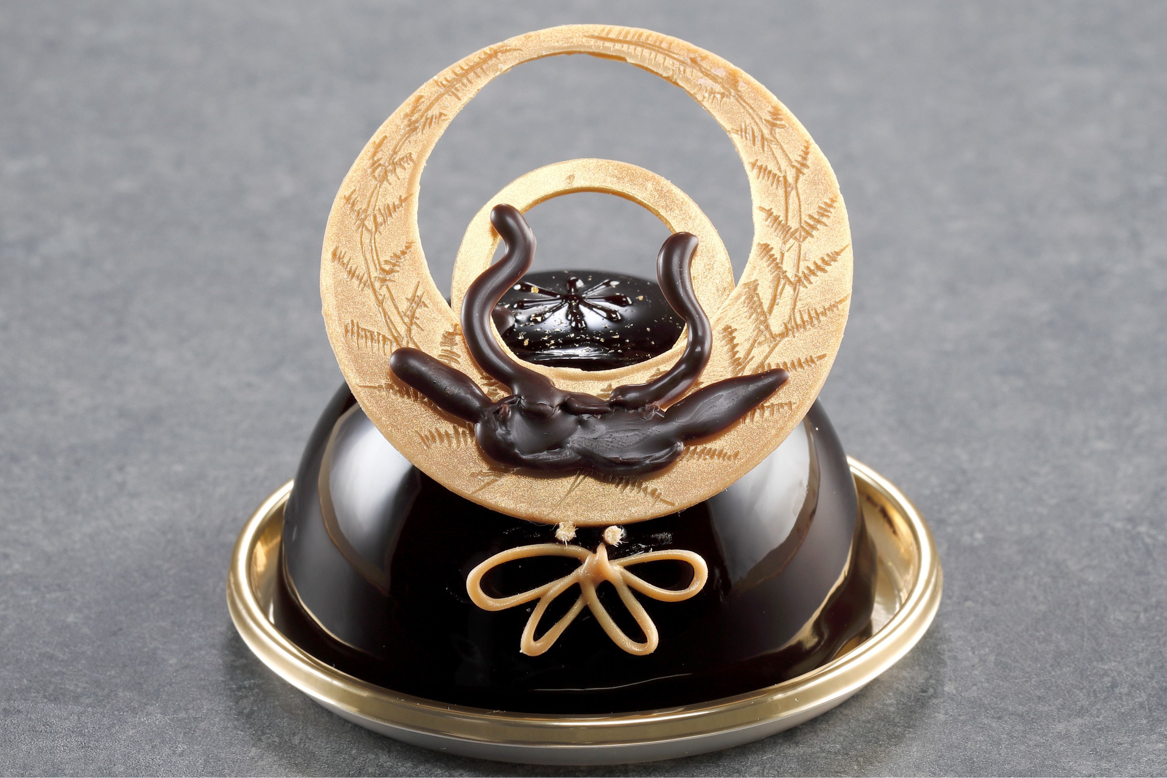 マンゴー、パッションフルーツ、チョコレートで仕上げたエキゾチックでさわやかな甘さのムースケーキ。豊臣秀吉の兜「一の谷馬蘭後立付兜」を表現しました。