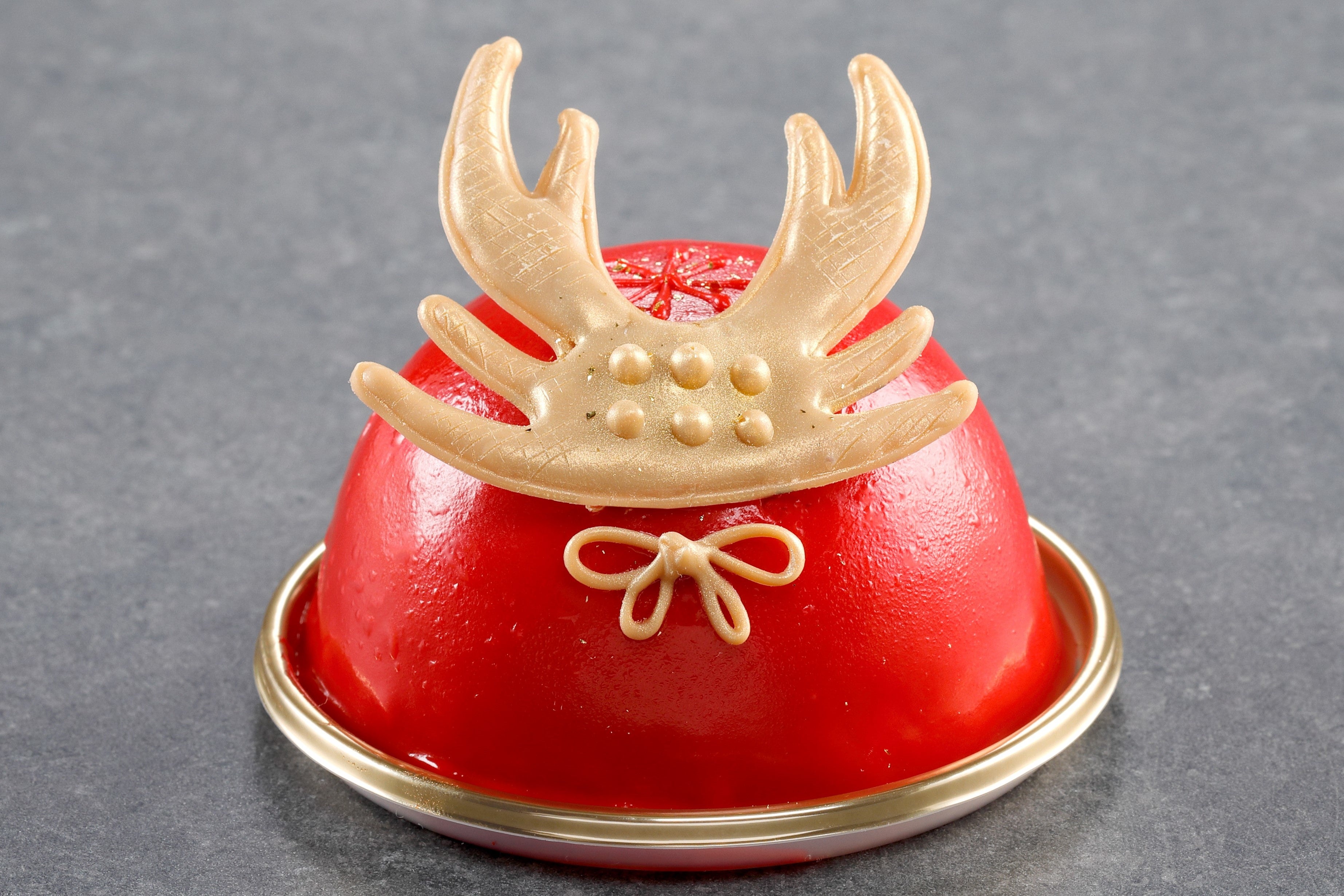いちごとピスタチオフレーバーのさっぱりとした味わいのムースケーキ。真っ赤な兜に「鹿の角」と「六文銭」をあしらった真田幸村の兜を表現しました。