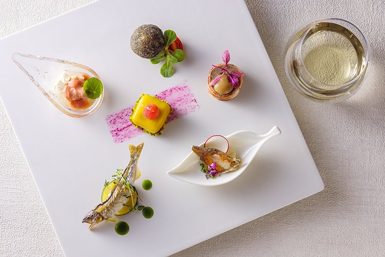 例えば前菜は、五味(苦味、旨味、酸味、塩味、甘味)に合うよう、3種の中で最も日本酒らしい旨味のある味わいの『里の音 野(さとのね の)』を合わせるなど、当ホテルのシェフが考えたコース料理をご用意。ホテルおすすめのペアリングを堪能しつつ、新酒『里の音』3種と既存の『里山』の飲み比べもお愉しみください。