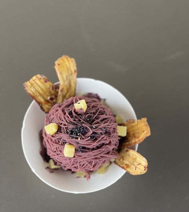 『紫いもんぶらん』は、SNSで人気爆発!1日100杯以上完売する、当店の大人気商品「贅沢おいもんぶらん」の新フレーバーです。濃厚な旨味に包まれた「紫芋」をたっぷりと使用した見た目もインパクトのある商品に仕上がりました。なめらか食感のさつまいもマッシュと、とろけるミルクジェラートでできた土台に、紫芋のペーストを目の前でたっぷりと絞ります。仕上げに、コロコロにカットしたさつまいも、紫いもんぶらん限定トッピングのサクッと食感がクセになる皮けんぴをトッピング。さつまいもの美味しさがギュッと凝縮された贅沢な商品に仕上がりました。