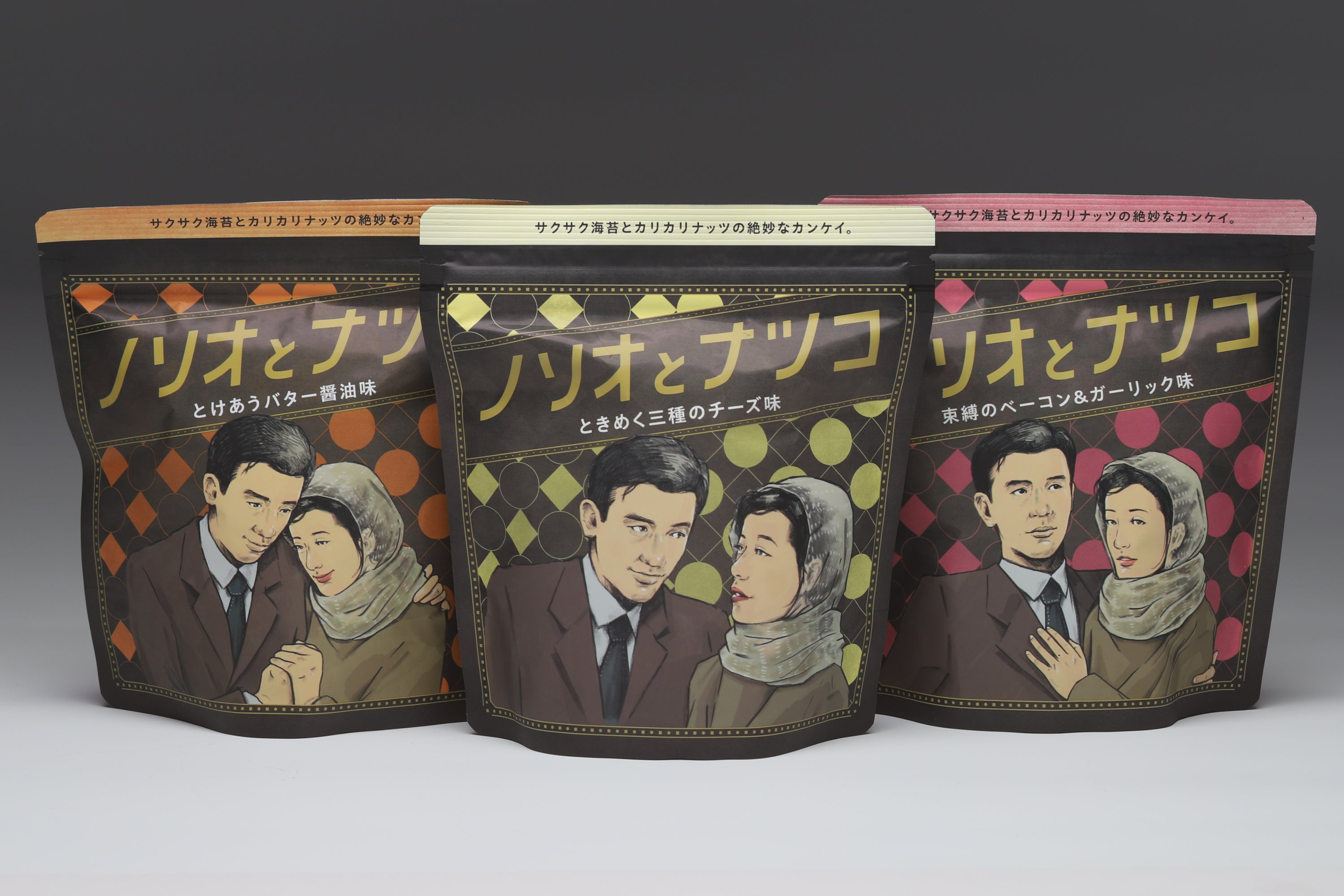 サンエイ海苔で加工した国産100%のばら海苔をサクサクに仕上げ、3種の人気のフレーバーで味付けし、カリカリのアーモンドとマッチングさせることでやみつきになるスナックが誕生しました。海苔はこだわりの国産のみを使用し、アーモンドはローストすることで香ばしい商品へと仕上げております。3種のフレーバーは、「“ときめく”三種のチーズ味」「“とけあう”バター醤油味」「“束縛の”ベーコン&ガーリック味」となり、お酒のつまみとなることを想定した味付けとなっております。フレーバー名は商品名でもある「ノリオ」と「ナツコ」の恋模様を表現し、パッケージデザインにも力を入れました。二人の恋模様はTwitterでも配信していきます。