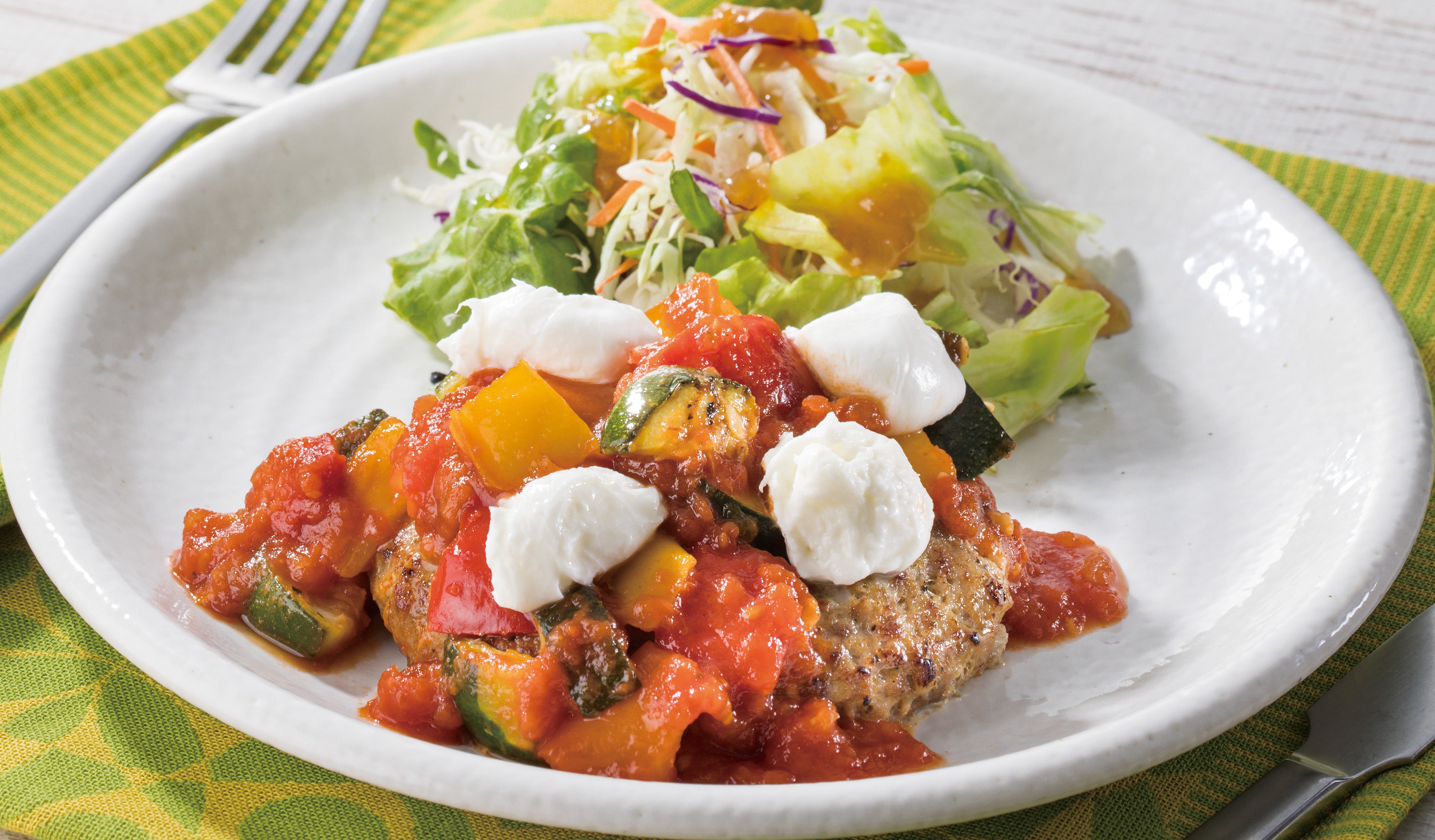 トマトをたっぷり加えて作った自家製トマトソースにグリルしたズッキーニ、ナス、赤ピーマン、黄ピーマンで彩りも鮮やかに。