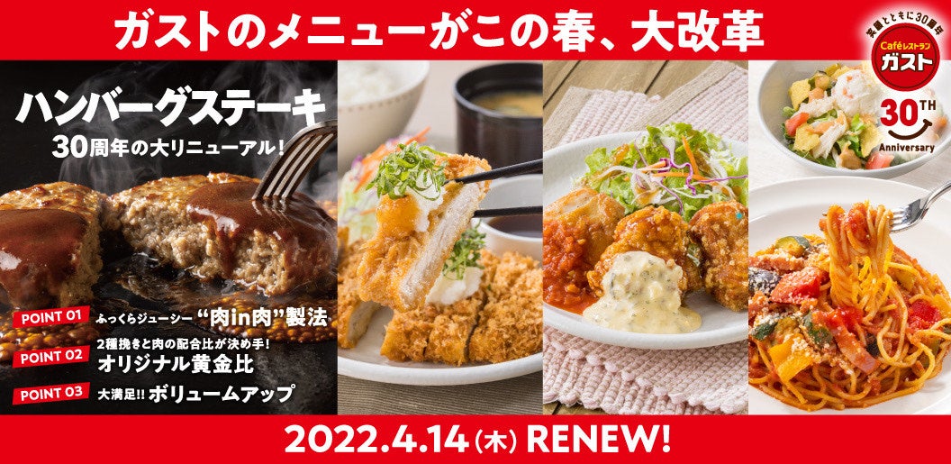 株式会社すかいらーくレストランツ(本社・東京都武蔵野市、代表取締役社長 大川原利明)が運営するガストは、2022年3月に創業30周年を迎えました。お客様のお食事のひと時がより楽しく、豊かな時間となるよう、4月14日(木)より、メニューを大幅にリニューアルいたします。