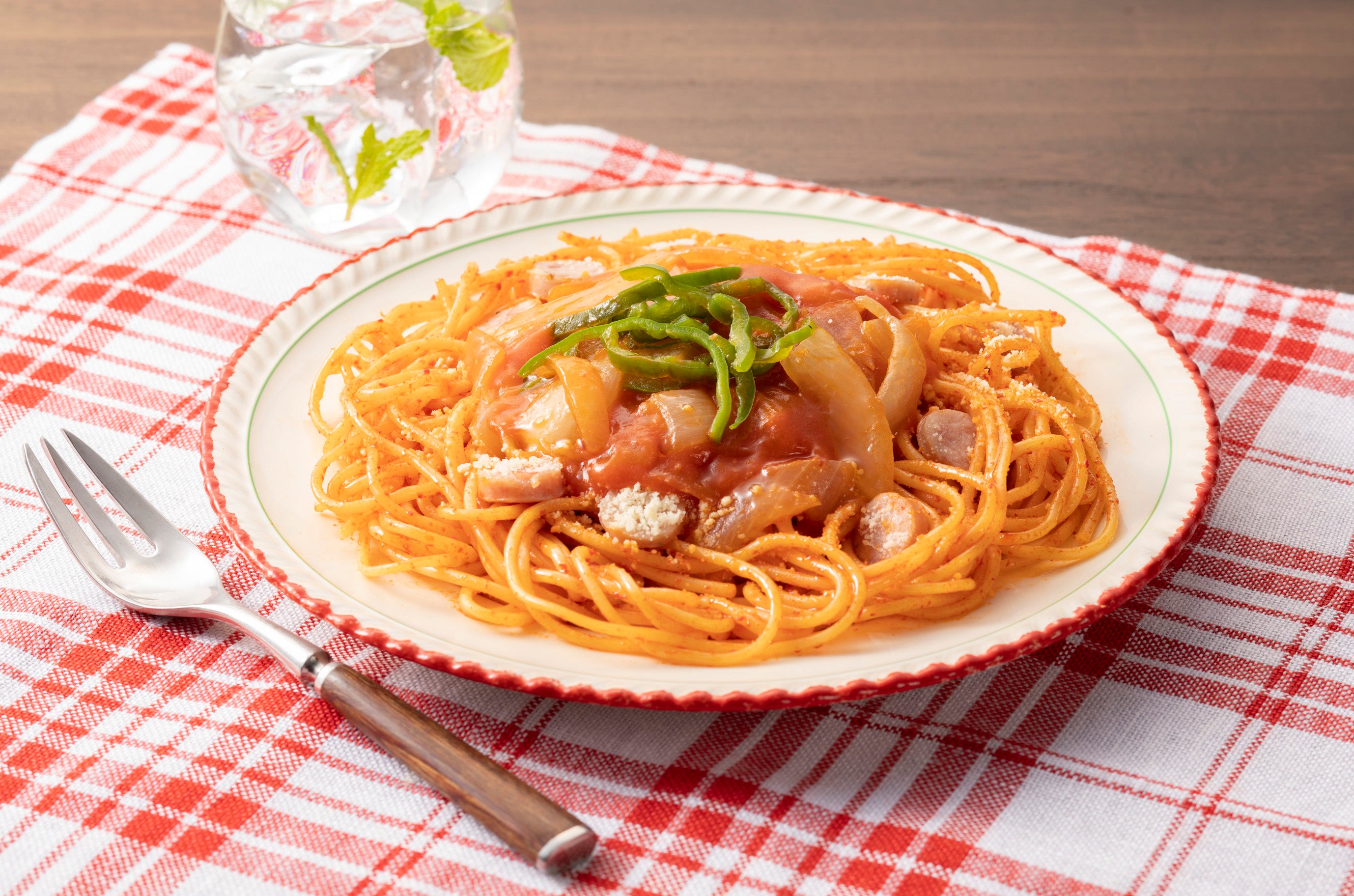 店舗で提供しているメニューをもとに開発した子供から大人まで楽しめるナポリタンです。トマトの酸味を適度に飛ばした甘酸っぱいトマトソースとタンパク質含有量が多いデュラム小麦を原料とした食感の良いパスタ麺は相性抜群です。