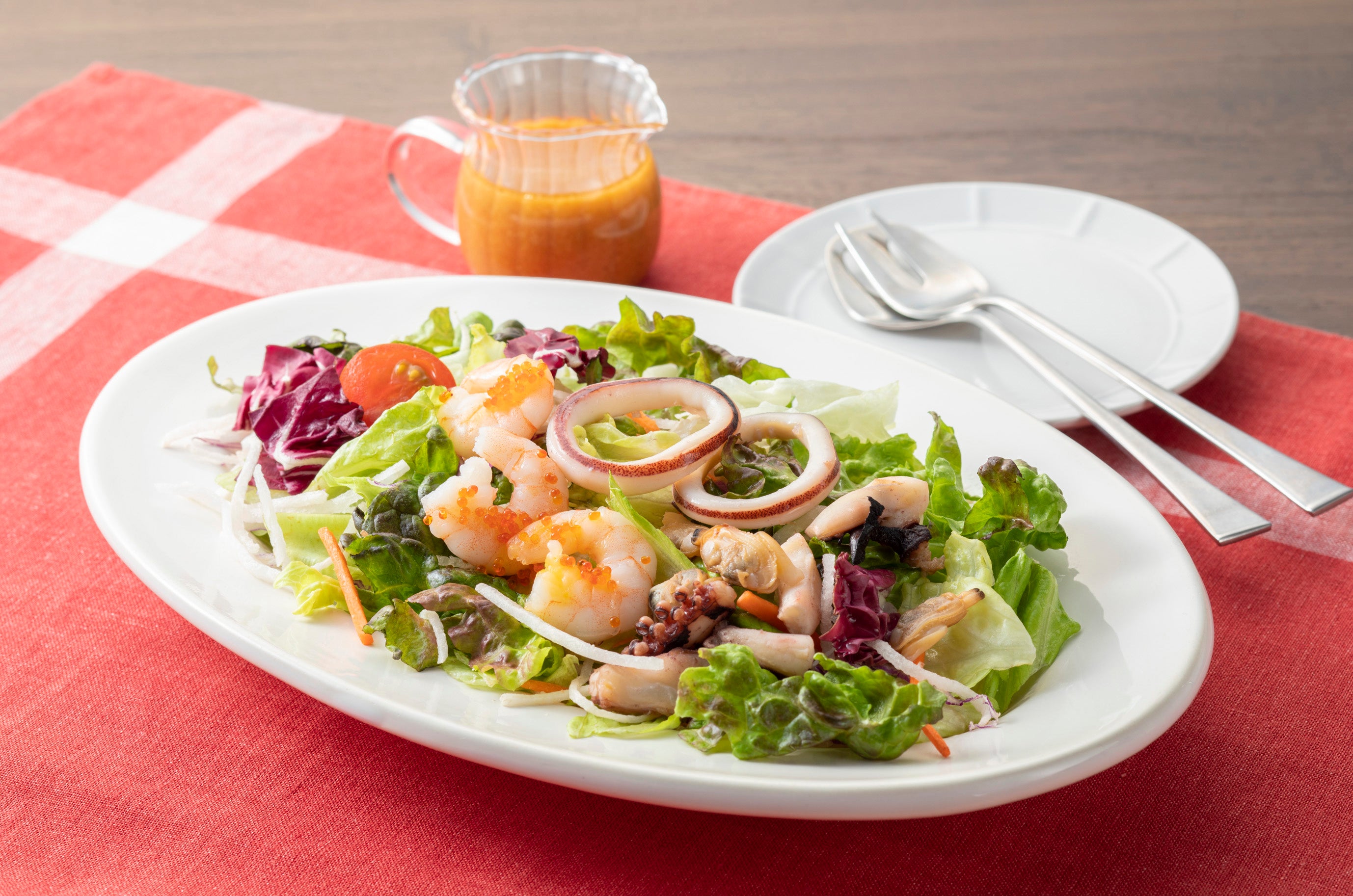 初来店の方がほぼ必ず注文する創業当時からの人気No.1メニュー「カリブサラダ」をもとにして開発。宝石のようにちりばめられた海老、いか、あさりなどのシーフードをトッピングしています。『イルキャンティ ドレッシングタイプ』をかけることで、前菜のように楽しんでいただけます。