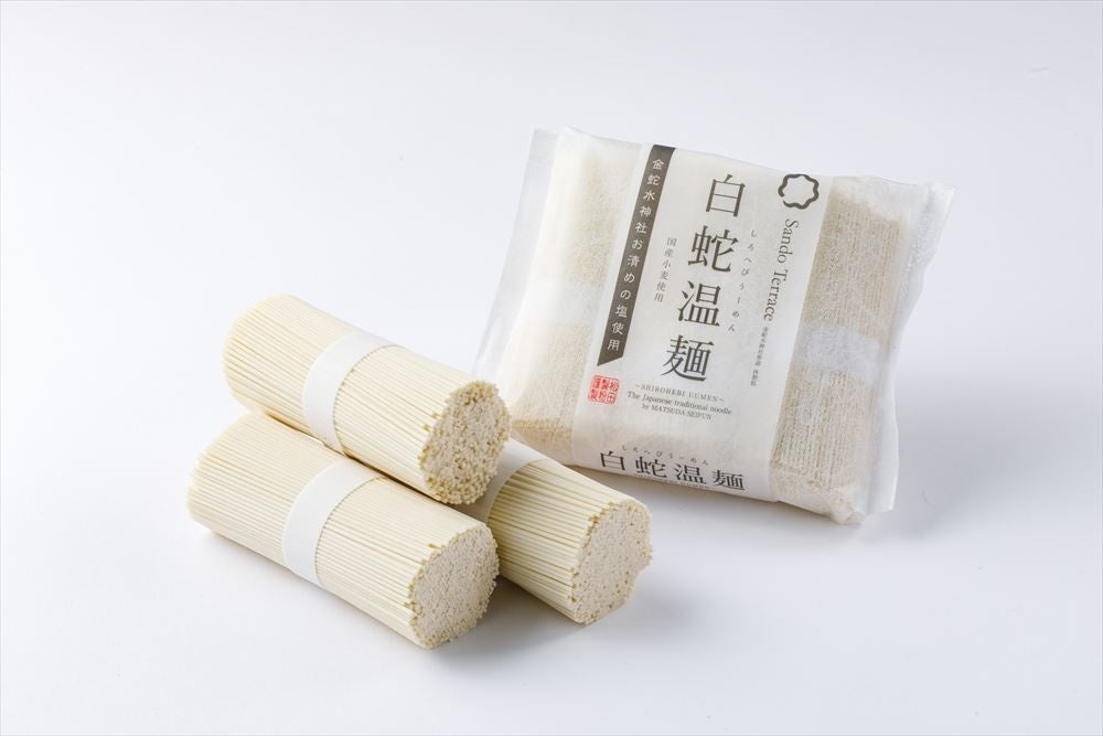「地産地消」さらには「地産外消」そして「地方創生」を目指し、そばの本場である山形の玉谷製麺所と神社とのご縁でできた品です。白く細く、通常のそばより長い『白蛇そば』。皆様の幸せが長く続き、様々なご縁が紡がれますよう祈りを込めて皆様にお届けいたしたく存じます。