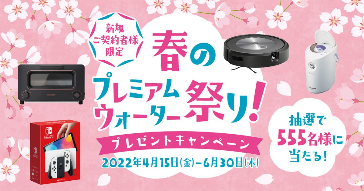 良質な水を育む日本有数の水源地から採取した天然水を、おいしさもミネラル分もそのままに保つ非加熱処理を施しご家庭に提供しているプレミアムウォーター株式会社(所在地:東京都渋谷区、代表取締役社長:金本 彰彦)は、2022年4月15日(金)より、『春のプレミアムウォーター祭り!プレゼントキャンペーン』を開催いたします。