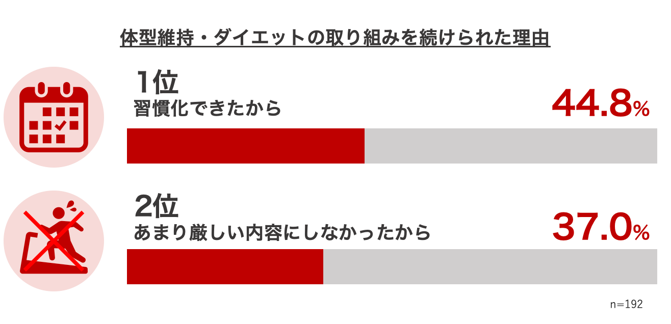 体型維持・ダイエット経験のある人の35.8%が途中で挫折しまった経験があると回答。挫折してしまった理由は、1位「面倒になって億劫になってしまった(71.0%)」、2位「効果が実感できなかった(53.3%)」ということが判明しました。一方で、続けられた人の理由は1位「習慣化できたから(44.8%)」、2位「あまり厳しい内容にしなかったから(37.0%)」となり、体型維持・ダイエットを続ける秘訣は、あまり厳しくなく、手軽に続けられて習慣化することにあるようです。