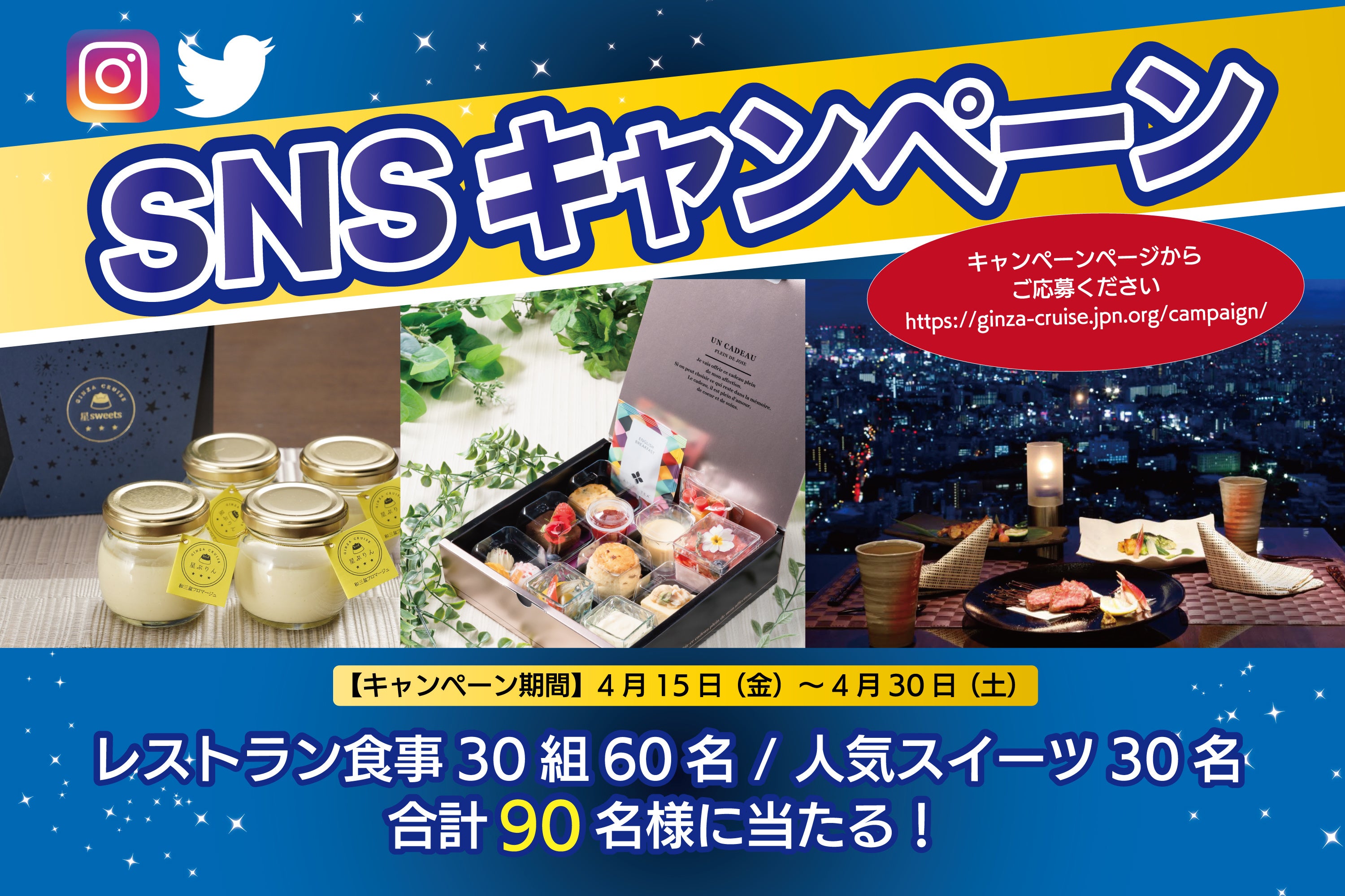 抽選で合計90名様に「高級レストランでの食事&人気スイーツが当たる」SNSキャンペーンを開催いたします。