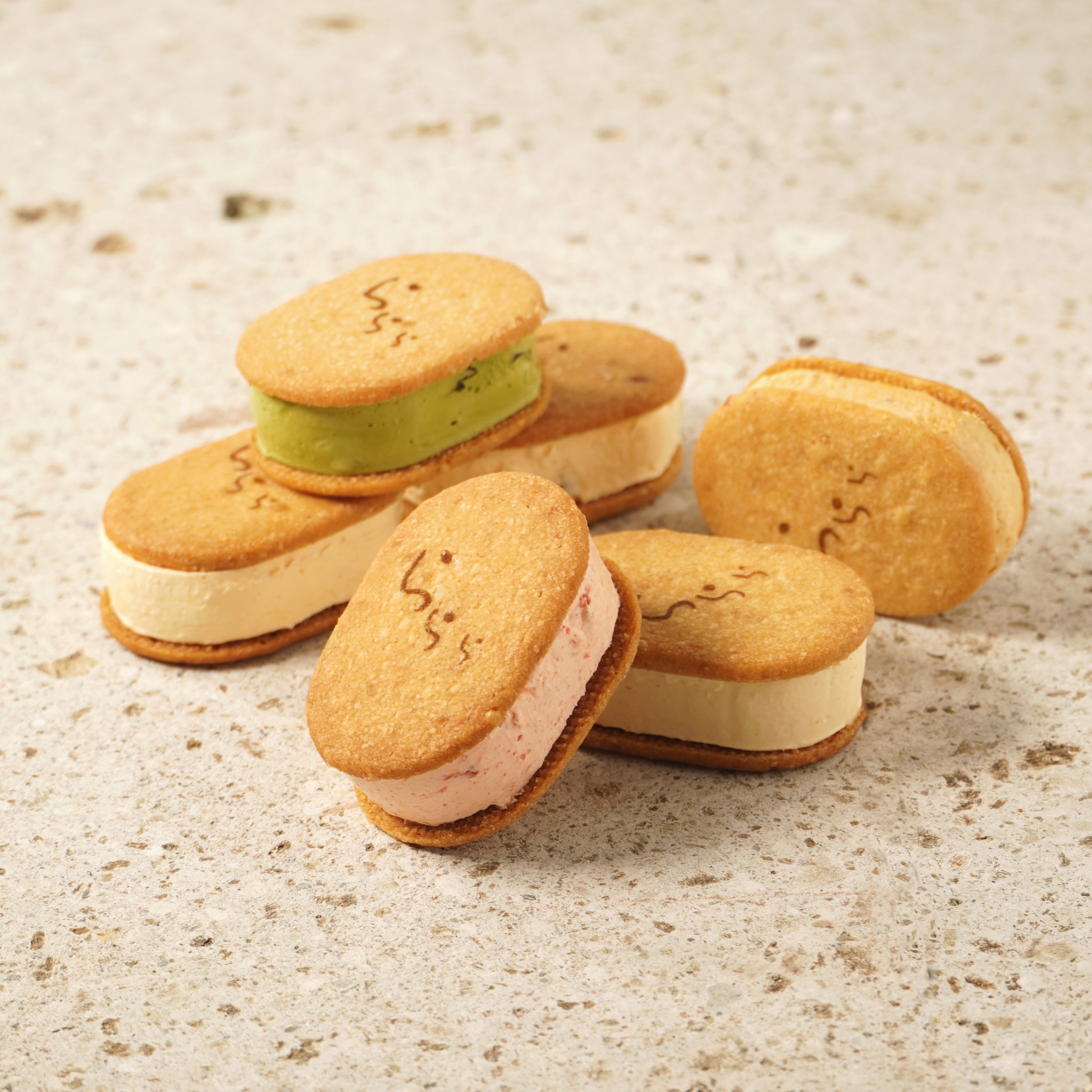 黒糖とキャラメリゼした国産ライスパフを合わせて焼き上げたサブレ生地で、苺、檸檬、柚子、酒粕れーずん、きゃらめる味噌の5種類のバタークリームをサンドしました。香りが高くえぐみのない柚子は宇都宮市の床井柚子園から、酒粕には井上清吉商店から、味噌には樋山昌一商店からと卵以外にもこだわりました。