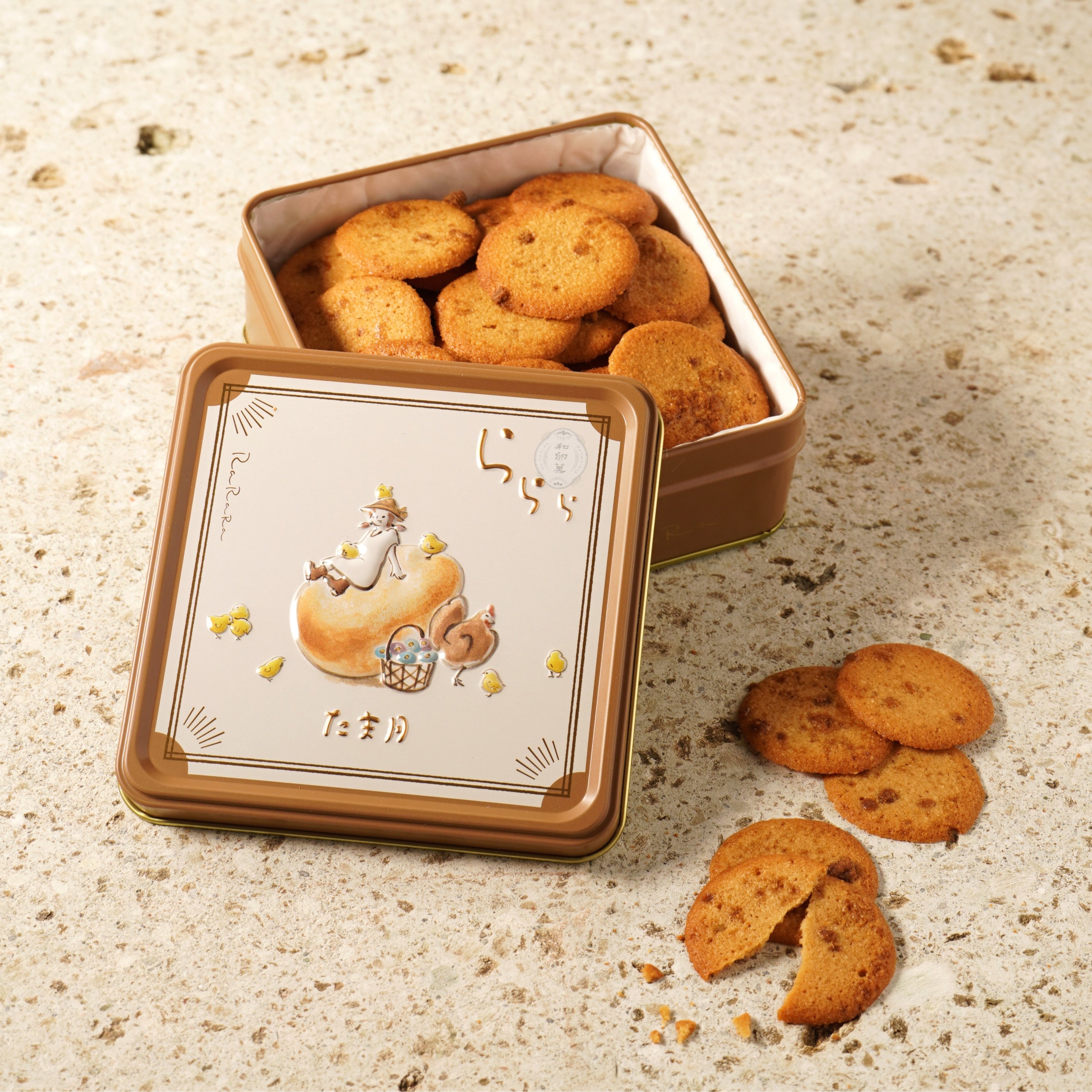 磨宝卵ゴールドの卵白を使用したラングドシャ生地に黒糖を混ぜ込み、さらに表面に黒糖をまぶし焼き上げました。香ばしくあと引く味わい。可愛い缶にもご注目下さい。