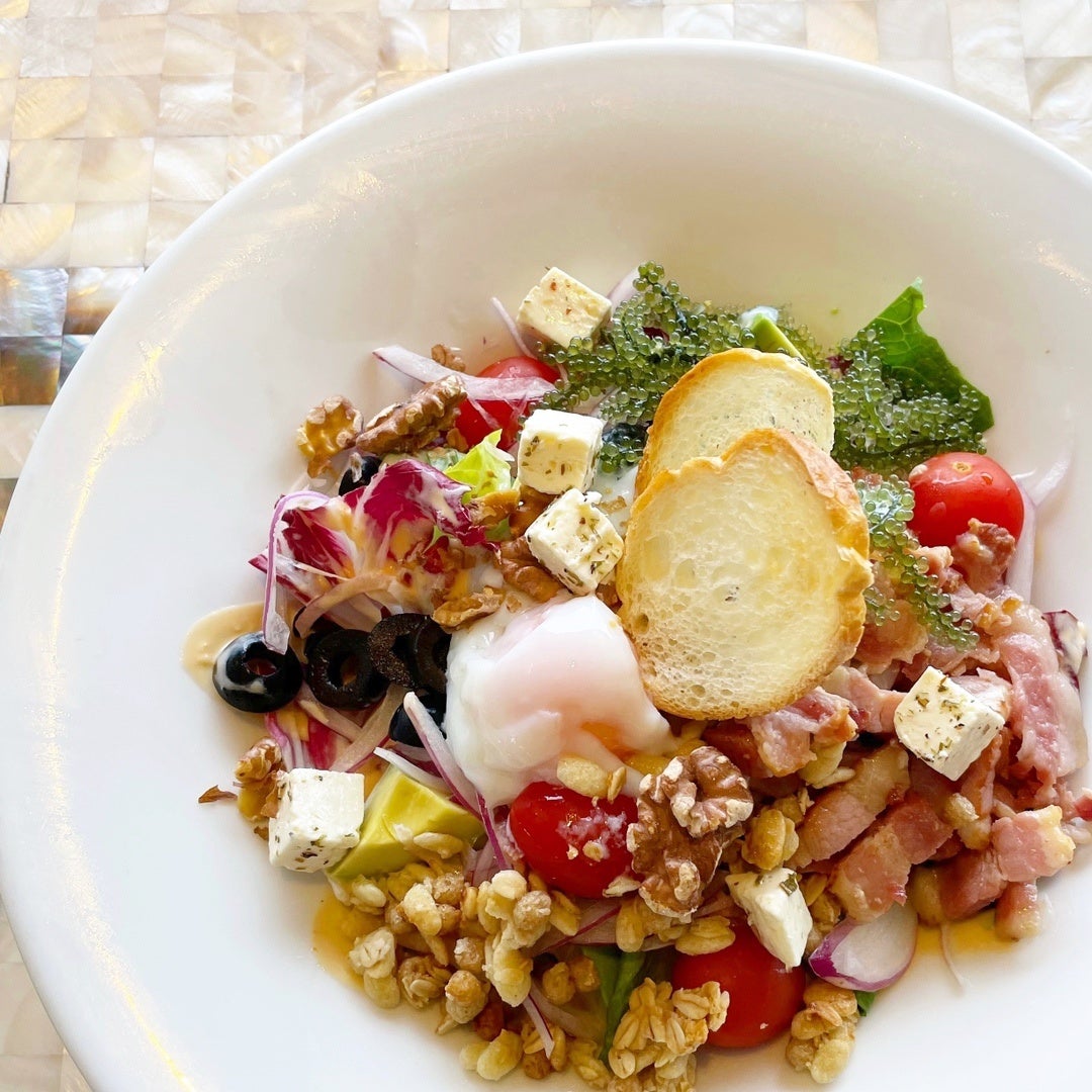 温泉卵を崩しながら、ざくざくと混ぜてお召し上がりください。しゃきしゃきとした新鮮な葉野菜に、もったりとしたアボカドやチーズが絡んで、沖縄ならではの食材海ぶどうがお口の中でぷちぷちと弾けます。一口ごとに食感が異なって、次の一口が楽しみになる一皿です。