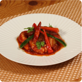 見た目は海老だけど、これは本当に大丈夫?と思われてませんか?これはタピオカとジャガイモと小麦を使った海老もどきです。その海老もどきを使って筍、人参、椎茸が入った海老チリに仕上げましたので、オススメです。激辛ではなくピリ辛です。