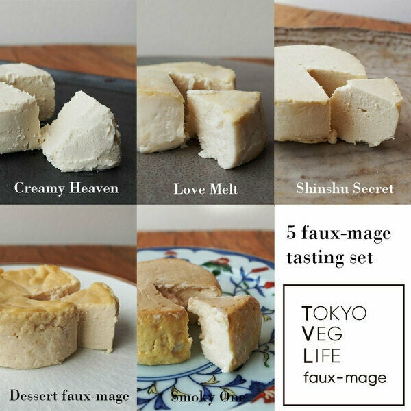 長野県の山中で手作りされたヴィーガンチーズ5種類のテースティングセットです。ベーシックな3種(Creamy Heaven、Love Melt、Shinshu Secret)に加えて、プレミアムな2種(Dessert faux-mage、Smoky One)をそれぞれ一口サイズで詰め合わせたセットになります。