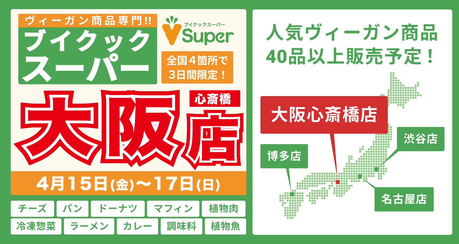 株式会社ブイクック(本社:兵庫県神戸市、代表取締役:工藤柊)は、2022年4月15日(金)〜4月17日(日)、大阪心斎橋にて3日間限定のヴィーガン商品専門「ブイクックスーパー」を開店いたします。