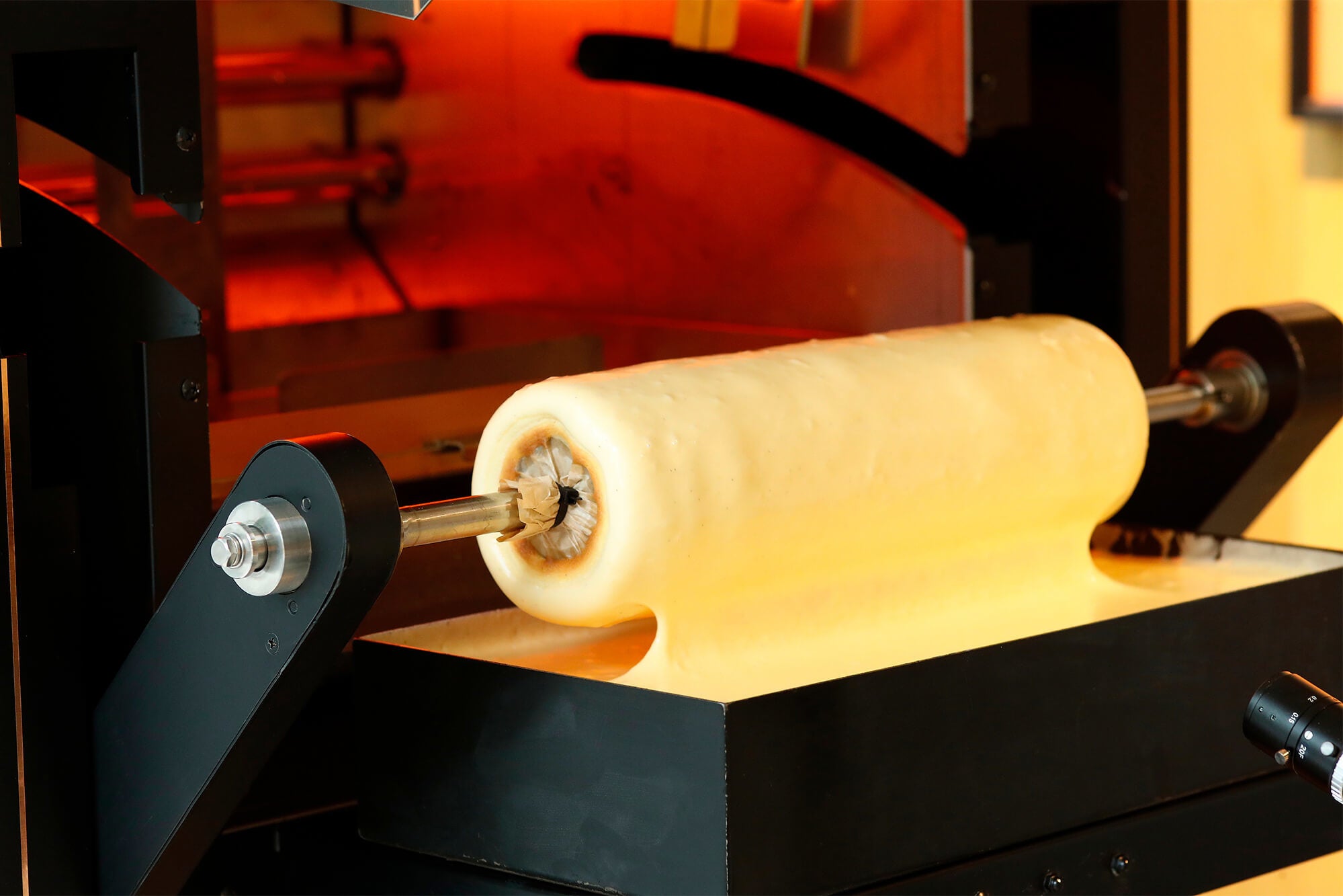 職人が焼く生地の焼き具合を、各層ごとに画像センサーで解析することで、その技術をAIに機械学習させデータ化、無人で職人と同等レベルのバウムクーヘンを焼きあげることができます。