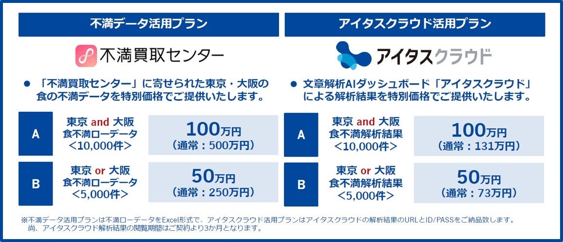 本レポートで利用した『不満買取センター』のデータと文章解析AIダッシュボード『アイタスクラウド』によるデータ解析結果を、特別価格でご提供いたします。ぜひこの機会にご活用ください。