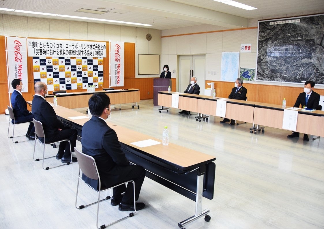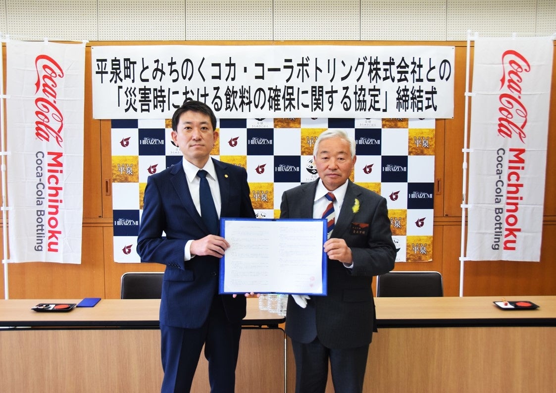 このたび、みちのくコカ・コーラボトリング株式会社(本社: 岩手県盛岡市、代表取締役社長: 谷村 広和)は、岩手県 平泉町(町長: 青木 幸保)との間で、「災害時における飲料の確保に関する協定」を締結することとし、4月15日(金)に締結式を開催いたしました。