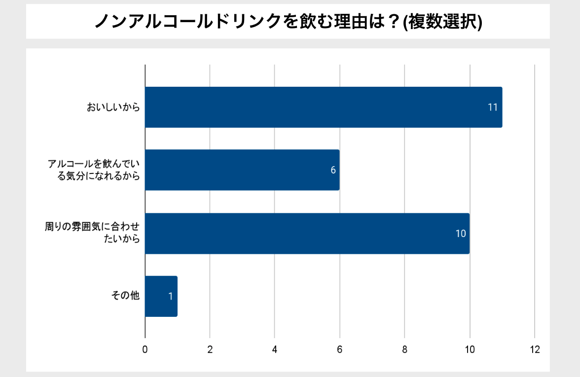 続いて先ほどの質問で「ノンアルコールドリンク*を飲む」と回答した人に、「ノンアルコールドリンクを飲む理由」も聞いてみました。(対象者:26人)