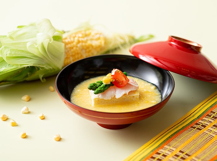 生でも食べられるスイートコーンを、すり流しと真薯の日本料理に仕立てました。