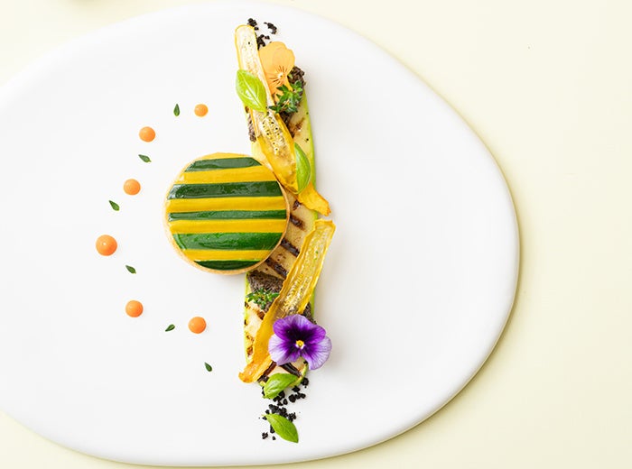 緑と黄色のズッキーニを使ったハーブが香る温かいタルトです。タルトの中にはズッキーニのラタトゥイユが詰まっています。