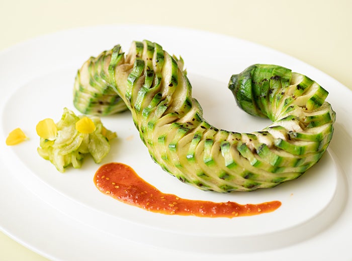 ドラゴンに見立てたヘチマに切り込みを入れ、韓国風甘辛たれに漬け込み、焼き上げました。