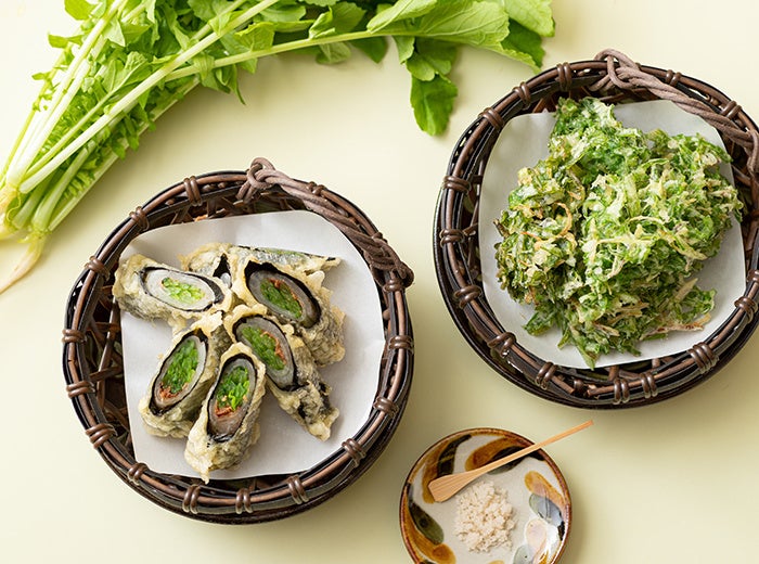 大根の若葉の葉と茎、味わいと食感を楽しむ2種類の天ぷらです。
