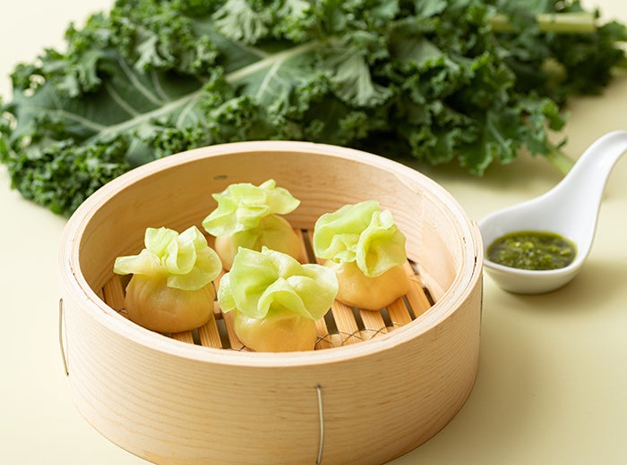 スーパーフードと言われる「ケール」を、焼売の生地・具材・ソースに使い、春キャベツ風に仕立てたヘルシーな焼売。