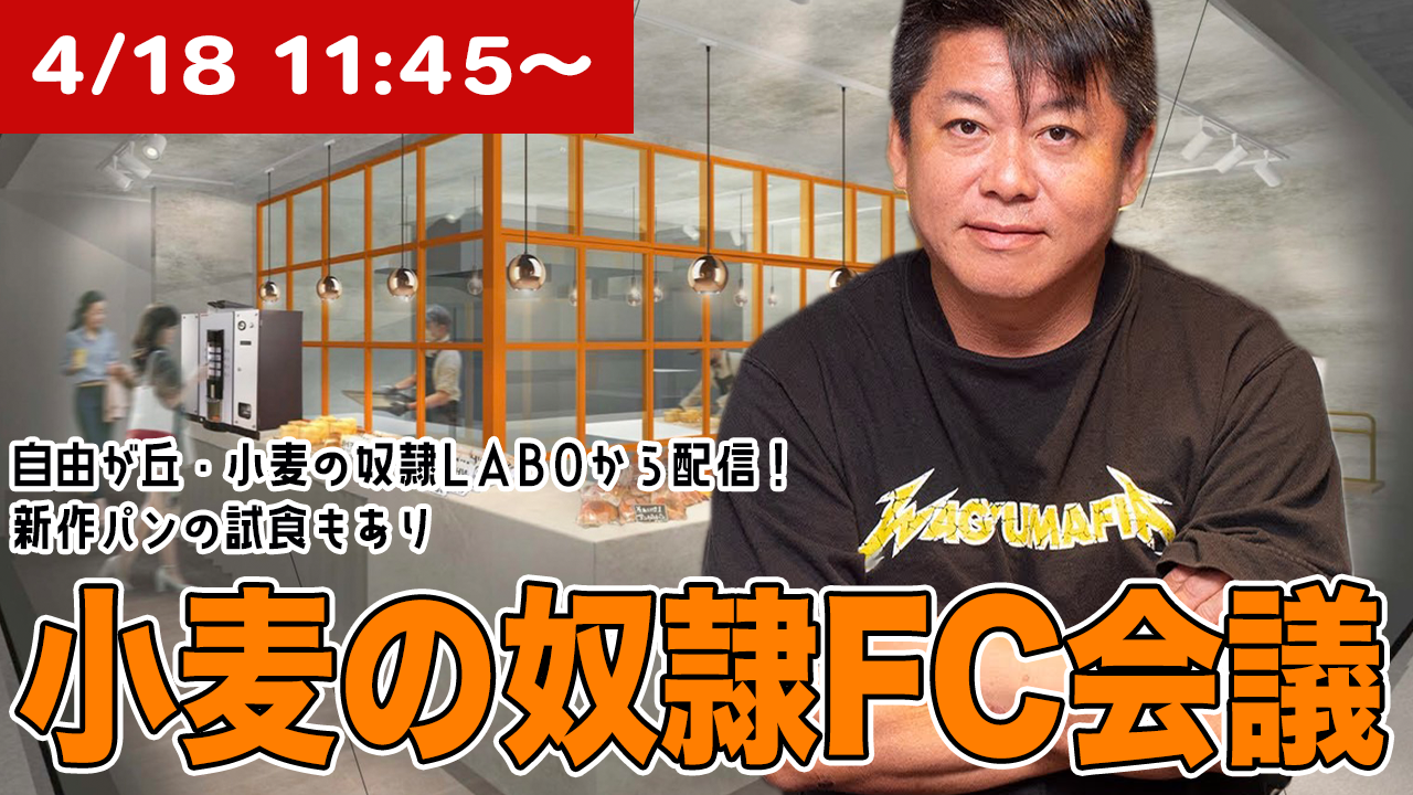 4月18日(月)に、YouTube【ホリエモンチャンネル】にて「小麦の奴隷FC会議」をライブ配信します。今回は、清澄白河店が移転リニューアルする新店舗「小麦の奴隷LABO 自由が丘」よりお届けします。(「小麦の奴隷LABO 自由が丘」は4月21日(木)オープン予定です。)