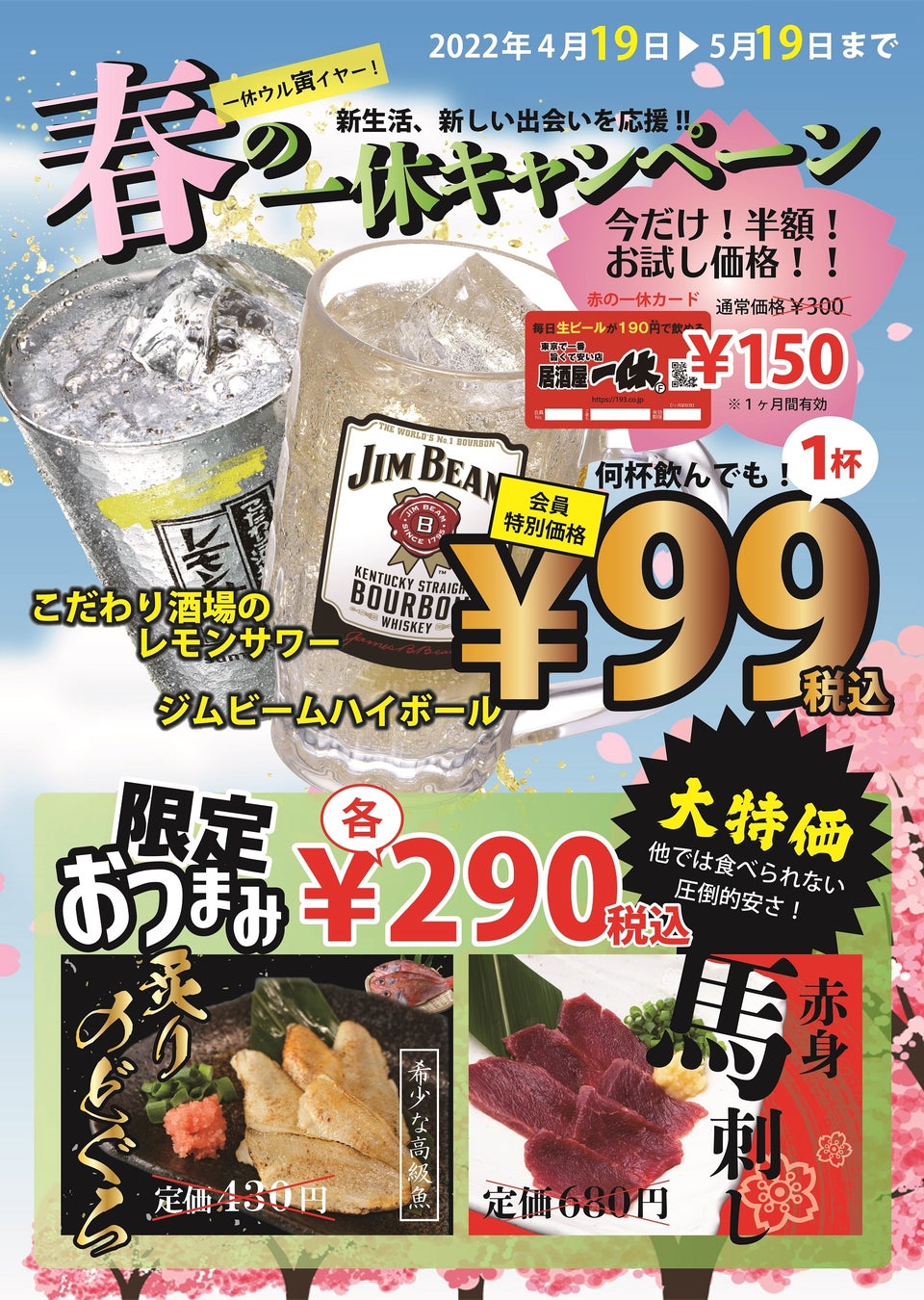 株式会社一休(本社:東京都東村山市、代表取締役:金子清範)は、『居酒屋一休』『焼鳥一休』全店におきまして春の一休キャンペーンを行います。このキャンペーンでは人気の「こだわり酒場のレモンサワー」「ジムビームハイボール」を会員価格99円でご提供いたします。さらに期間中はお試し価格の150円で一休会員カードを手に入れる大チャンス!