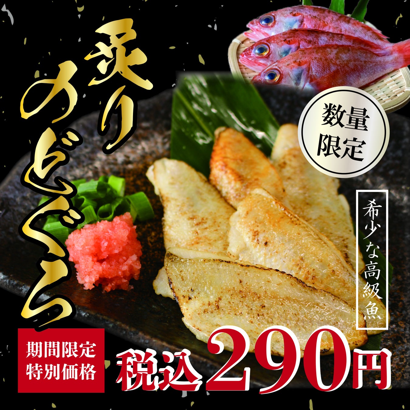 内容:期間中は数量限定で「炙りのどぐろ」と「赤身馬刺し」をそれぞれ290円でご提供いたします。