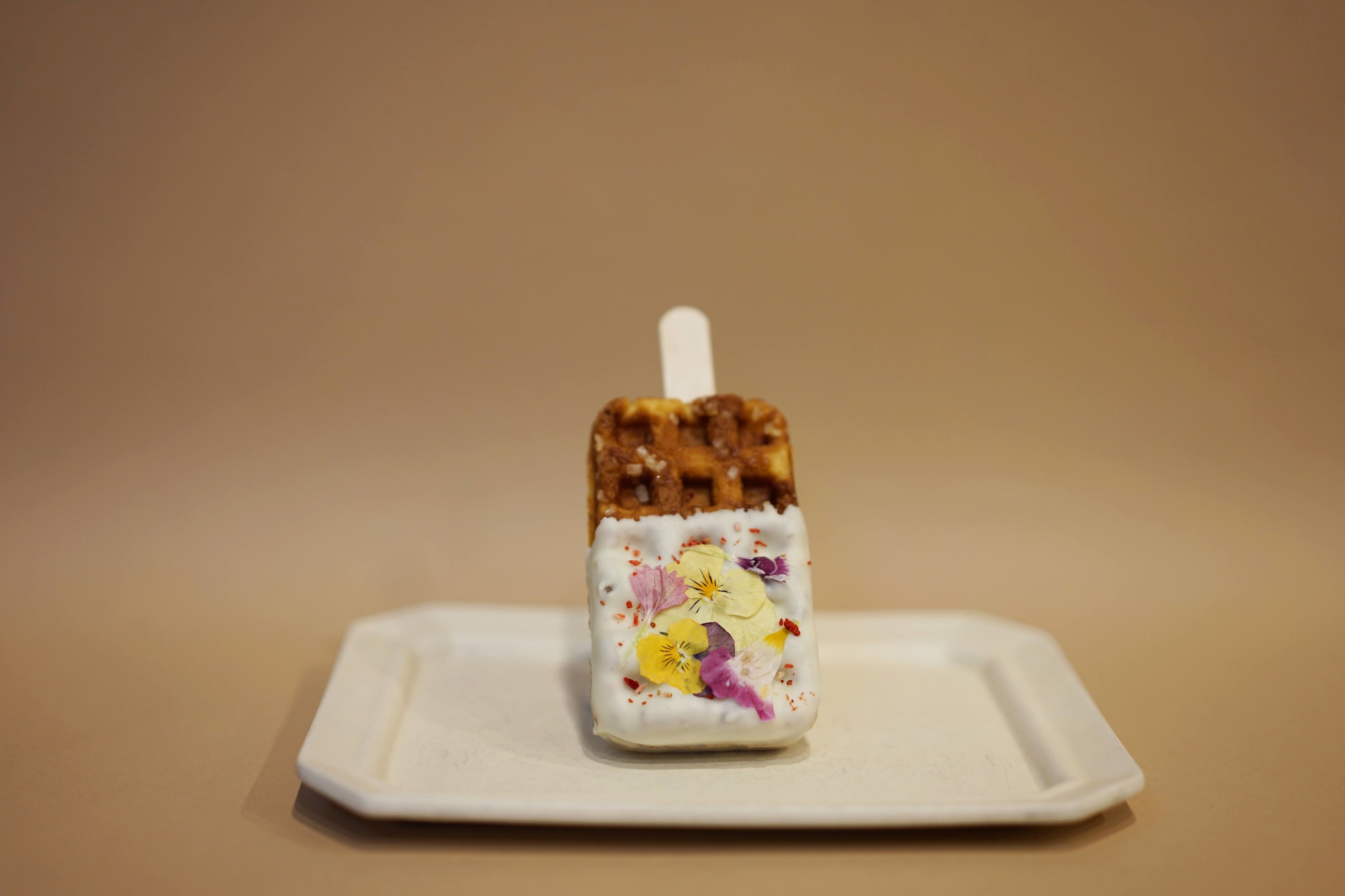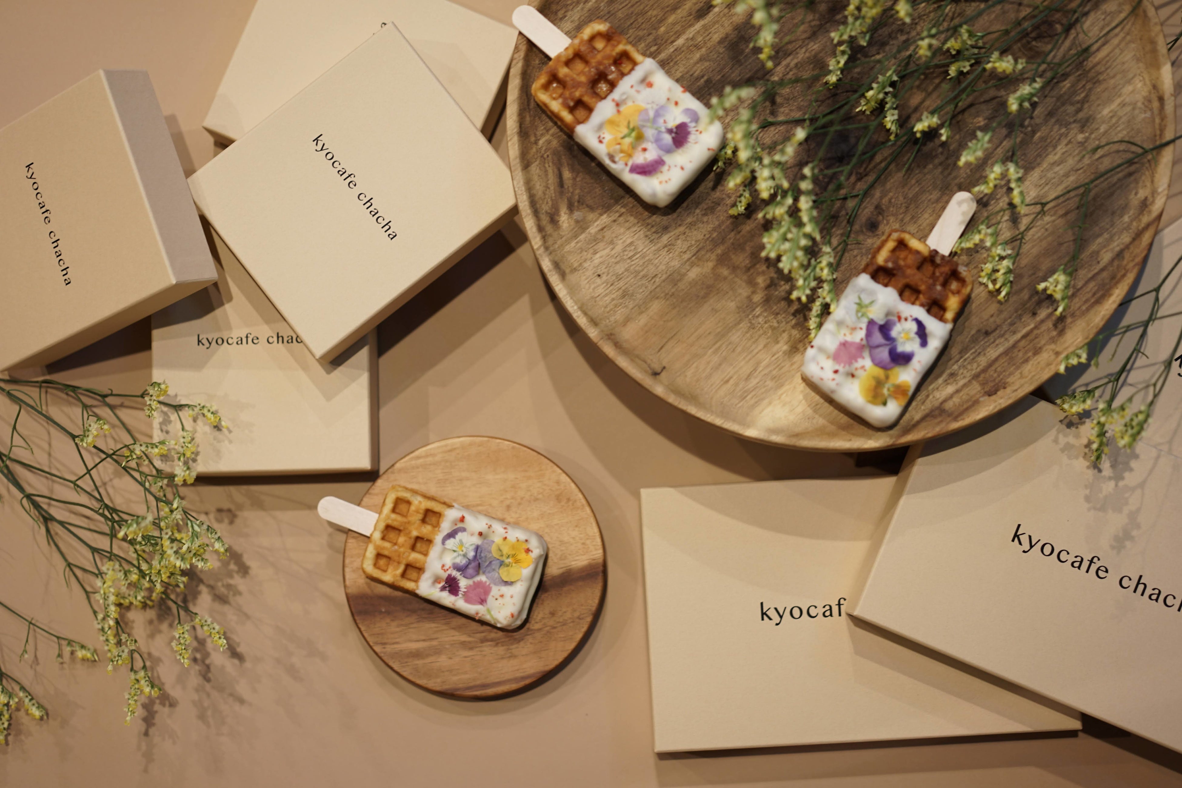 京ワッフルにホワイトチョコをディップし、エディブルフラワーとドライストロベリーをトッピング。エディブルフラワーがトッピングされていることで、”きゅん”とするかわいさだけではなく、上品な京ワッフルになるようこだわりました。