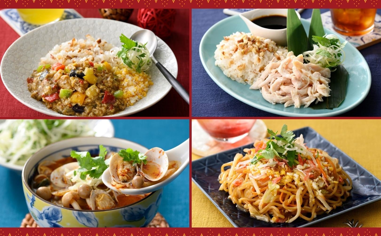 旅行先としても人気の高い『タイ』からは、エスニックな香りと甘辛い鶏挽肉がたまらない!食欲をそそる『ガパオライス』。屋台で人気の麺料理、ほんのり酸味が効いた甘辛い味付けにえびの香ばしさがたまらないパッタイ風にアレンジした『パッタイ風焼きそば』。後を引く酸味と辛味が特徴の旨辛スープの『トムヤムクン』などの定番メニューが勢ぞろい!