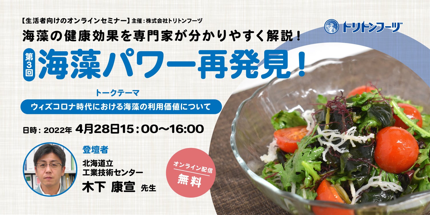 株式会社トリトンフーヅ(本社:熊本県宇土市城塚町169-1、代表取締役社長:髙木 良樹、以下トリトンフーヅ)は、排塩・免疫力UPなど、海藻の健康効果を専門家が解説する全6回のオンラインセミナー「海藻パワー再発見」を開催いたします。第3回「ウィズコロナ時代における海藻の利用価値」は、北海道立工業技術センター 木下 康宣氏をお招きし、4月28日(木)にウェビナーにて実施いたします。