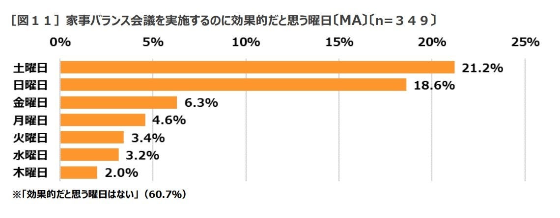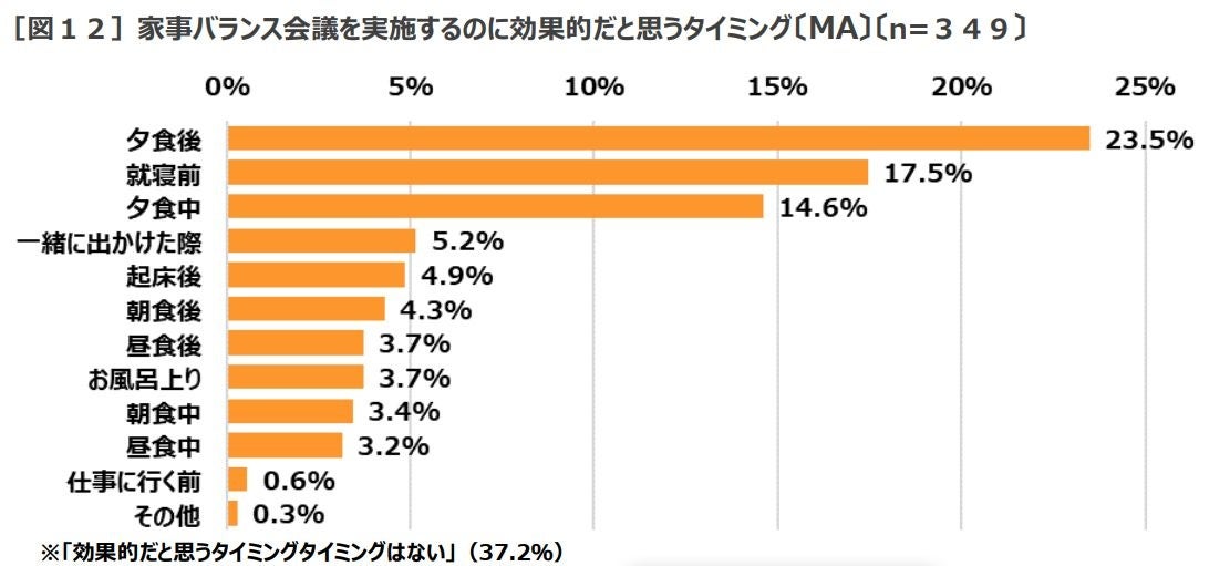 コロナ禍に『家事バランス会議』をしていると回答した349人に対し、効果的だと思う『家事バランス会議』のタイミングについてお聞きすると、「効果的だと思う曜日・タイミングはない」と答えた方を除いて、曜日では「土曜日」(21.2%)、「日曜日」(18.6%)が僅差となり、[図11]タイミングでは「夕食後」(23.5%)が最も多いことが分かりました。[図12]お互いが気持ちにゆとりのあるタイミングが効果的なのかもしれません。※複数回答