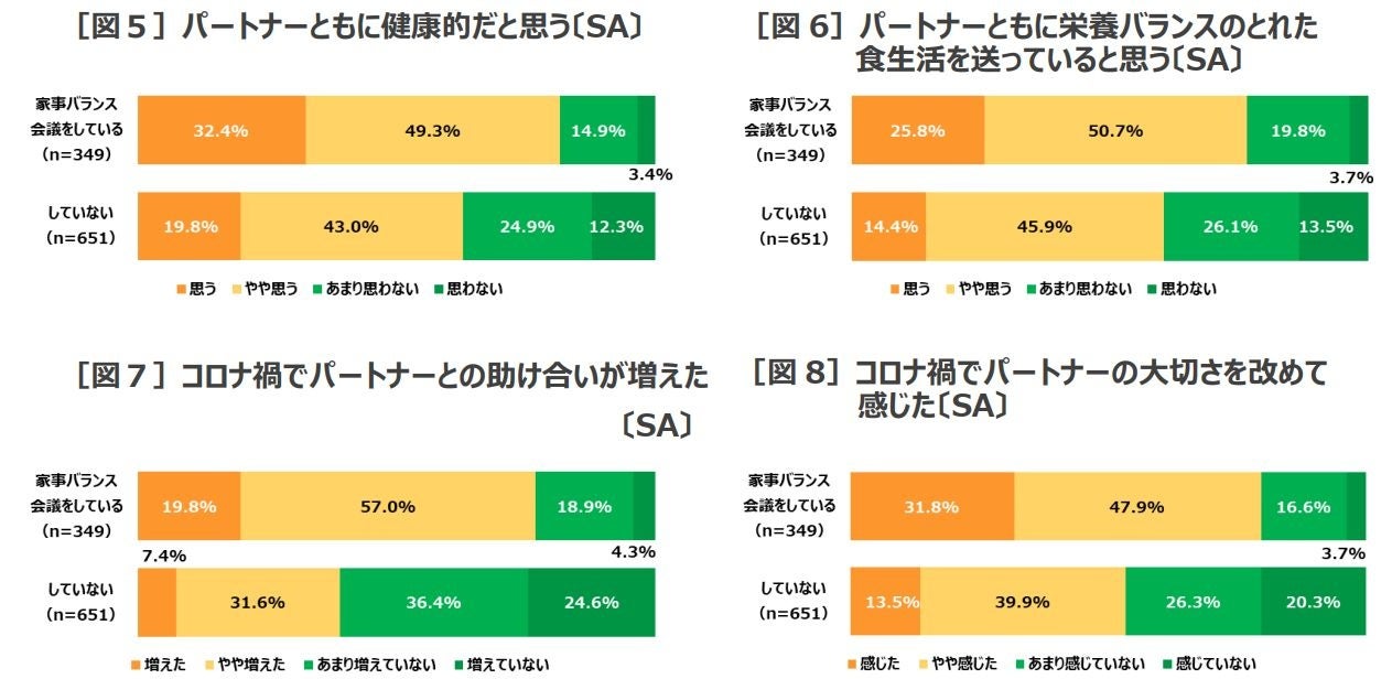 他にも、「パートナーともに健康的だと思う」、「パートナーともに栄養バランスのとれた食生活を送っていると思う」、「コロナ禍でパートナーとの助け合いが増えた」、「コロナ禍でパートナーの大切さを改めて感じた」のスコアが『家事バランス会議』をしている家庭の方が高く、『家事バランス会議』と相関があるといえます。[図5、6、7、8]