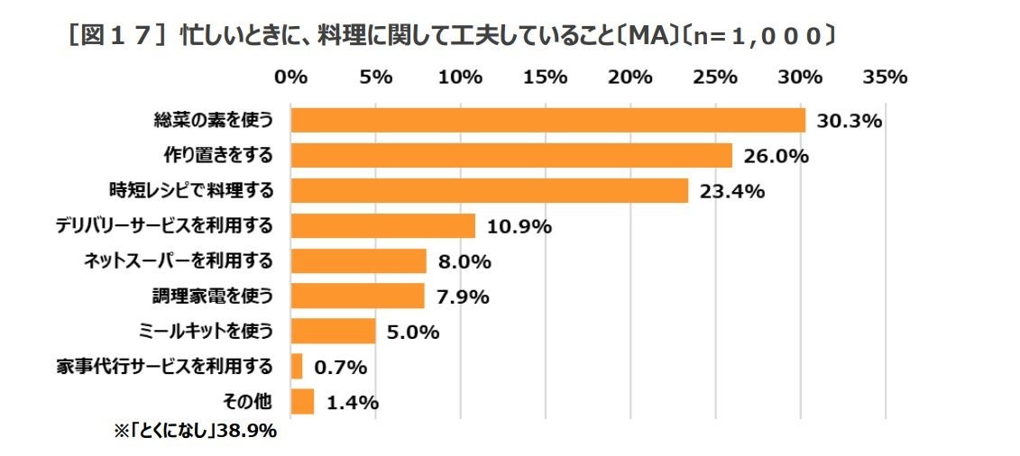 忙しいときに料理に関して工夫していることをお聞きすると、「とくになし」を除き、最も多い回答は、具材を入れて調理すると完成する、合わせ調味料など「総菜の素を使う」が30.3%で1位となりました。[図17]※複数回答