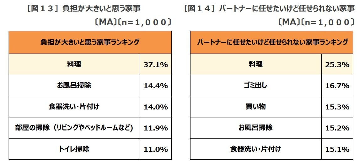 - 最も負担が大きい家事は「料理」。さらにパートナーに任せたいけど任せられないランキングでも1位に