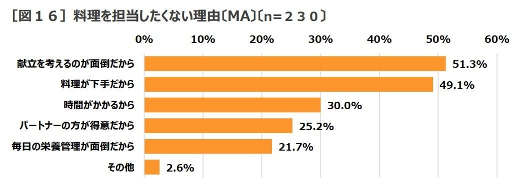 また、担当したくない家事をお聞きしたところ「料理」と回答した方は全体の23.0%で1位でしたが、その理由は、「献立を考えるのが面倒だから」51.3%、「料理が下手だから」49.1%という結果となりました。[図16]※複数回答
