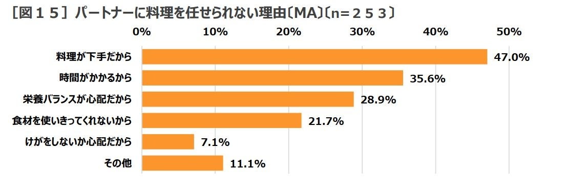 パートナーに料理を任せられないと回答した253人にその理由をお聞きしました。理由は、「料理が下手だから」47.0%、「時間がかかるから」35.6%、「栄養バランスが心配だから」28.9%と続く結果となっています。[図15]※複数回答