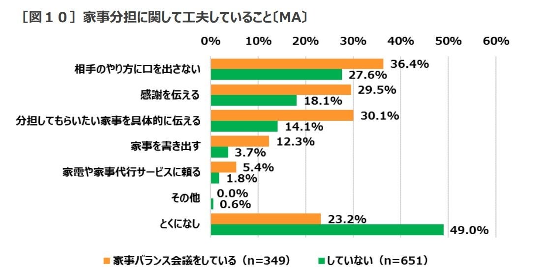 家事分担に関する工夫をお聞きすると、「相手のやり方に口を出さない」、「感謝を伝える」、「分担してもらいたい家事を具体的に伝える」という順になりました。『家事バランス会議』をしている家庭は「感謝を伝える」、「分担してもらいたい家事を具体的に伝える」という項目で、『家事バランス会議』をしていない夫婦と10ポイント以上の差がついています。[図10]※複数回答