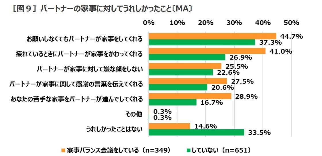 パートナーの家事に対してうれしかったことをお聞きすると、「お願いしなくてもパートナーが家事をしてくれる」が最も多い結果となりました。また、「疲れているときにパートナーが家事をかわってくれる」は『家事バランス会議』をしている家庭は41.0%に対し、『家事バランス会議』をしていない家庭は26.9%と14.1ポイント差となっています。『家事バランス会議』をする家庭ほど、困ったときにパートナーが家事をサポートしてくれるようです。さらに、「うれしかったことはない」という回答を見ても、『家事バランス会議』をしている家庭は14.6%、していない家庭は33.5%と18.9ポイント差となりました。家事をするなら、お互い何をしてくれたらうれしいのかを話し合うと、より良いのかもしれません。[図9]※複数回答