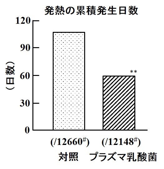 プラズマ乳酸菌を摂取していたグループにおいて、「発熱」など呼吸器感染症に起因する症状の発生日数が、