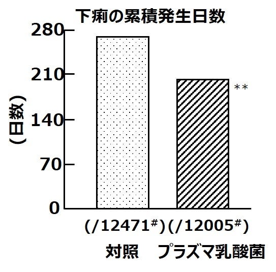 プラズマ乳酸菌を摂取していたグループにおいて、「下痢」など消化器に起因する症状の発生日数が有意に低下しました。