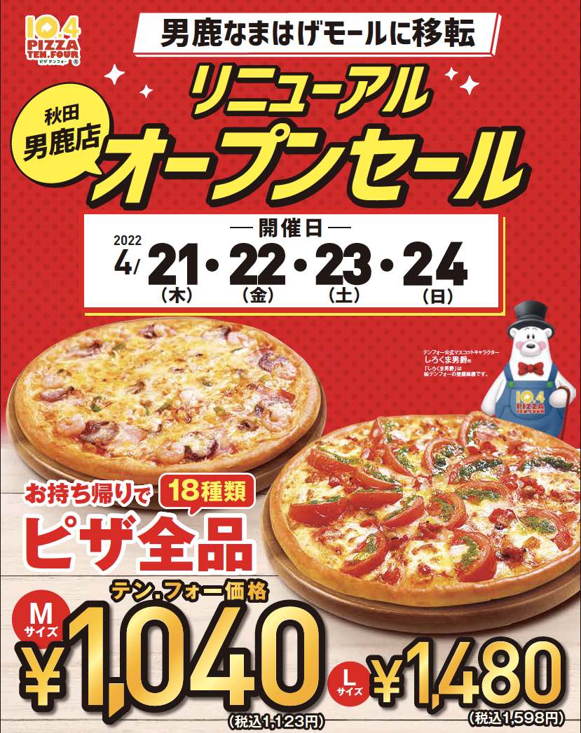 ピザテン.フォー秋田男鹿店のリニューアルオープンを記念してお持ち帰り限定のセールを実施いたします。