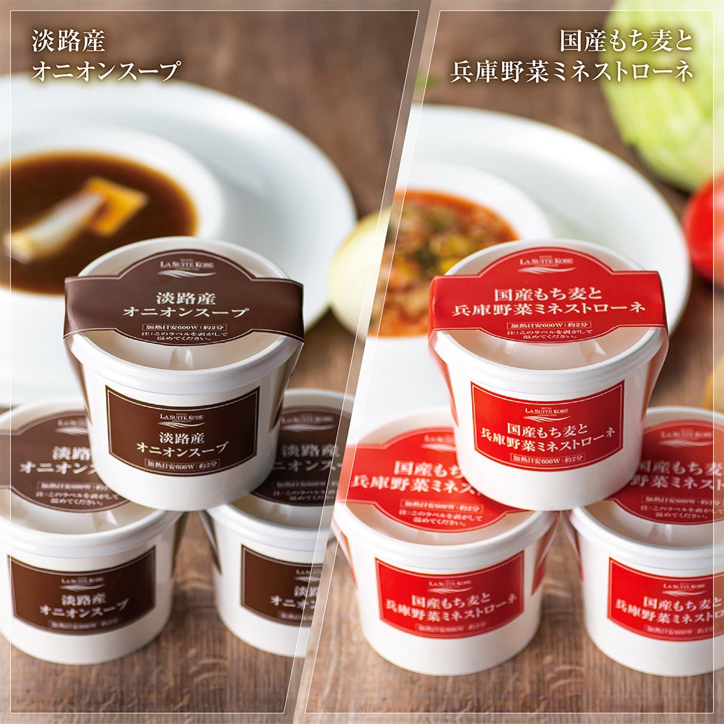 ホテル ラ・スイート神戸ハーバーランド(総支配人:檜山和司 所在地:神戸市中央区)直営のスイーツ&ベーカリー「ル・パン神戸北野」は、兵庫県産農作物を使ったテークアウト総菜シリーズの新作「国産もち麦と兵庫野菜ミネストローネ」と「淡路産オニオンスープ」を開発しました。同店の本店・伊丹空港店、大丸の梅田店・神戸店内のラスイートショップ、ラウンジ&バー「グラン・ブルー伊丹空港店」の計5店舗で、2022年4月18日(月)から販売しています。一部の店舗では、電子レンジを使い、その場で食べることも可能。容器ごと温めて皿に移さず食べられるよう、レンジでの温め時間も記載しています。
