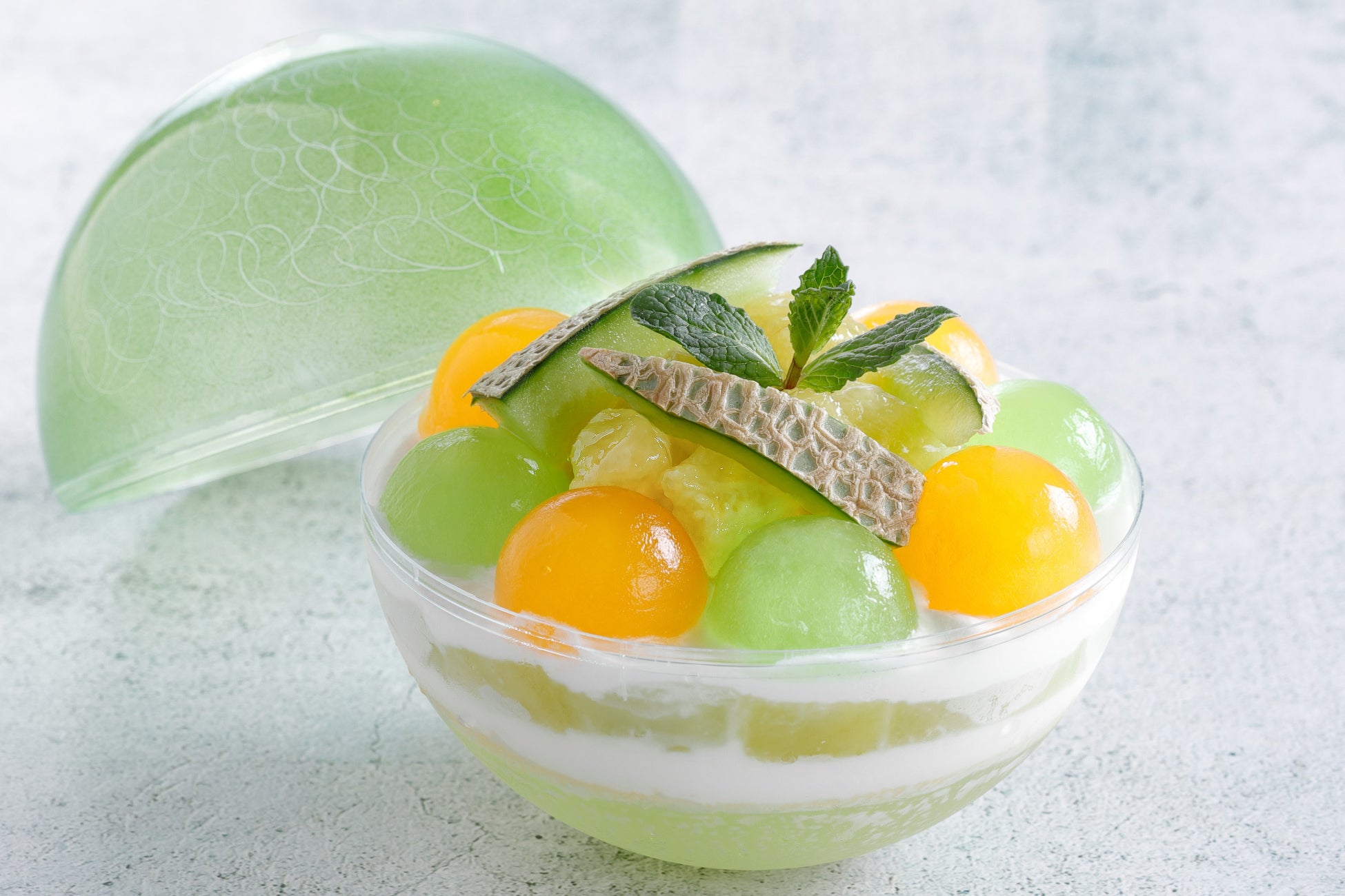月替わりで販売している「スイーツ スフィア」は透明のカプセルにスイーツを閉じ込めた、華やかな断面アートも楽しめるフォトジェニックなスイーツです。5月は上品な甘さが魅力のマスクメロンを使用し、ココナッツクリームのさわやかな風味が際立つ初夏におすすめのスイーツに仕上がりました。カプセルの蓋には緑色のカカオバターでメロンの網目を模りました。